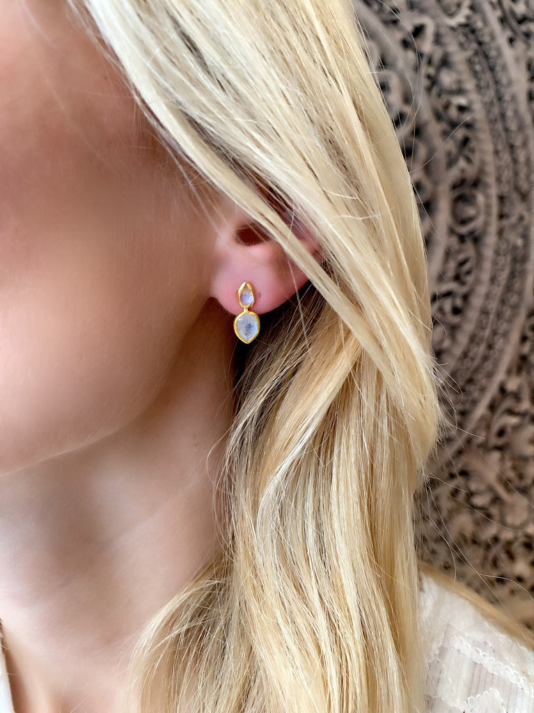 Our Marquise Double Drop Studs come in warm shade stones such as Garnet, Peridot, Citrine, Tourmaline and in cool shade stones such as Aqua Chalcedony, Rainbow Moonstone, Rose Quartz and Labradorite.